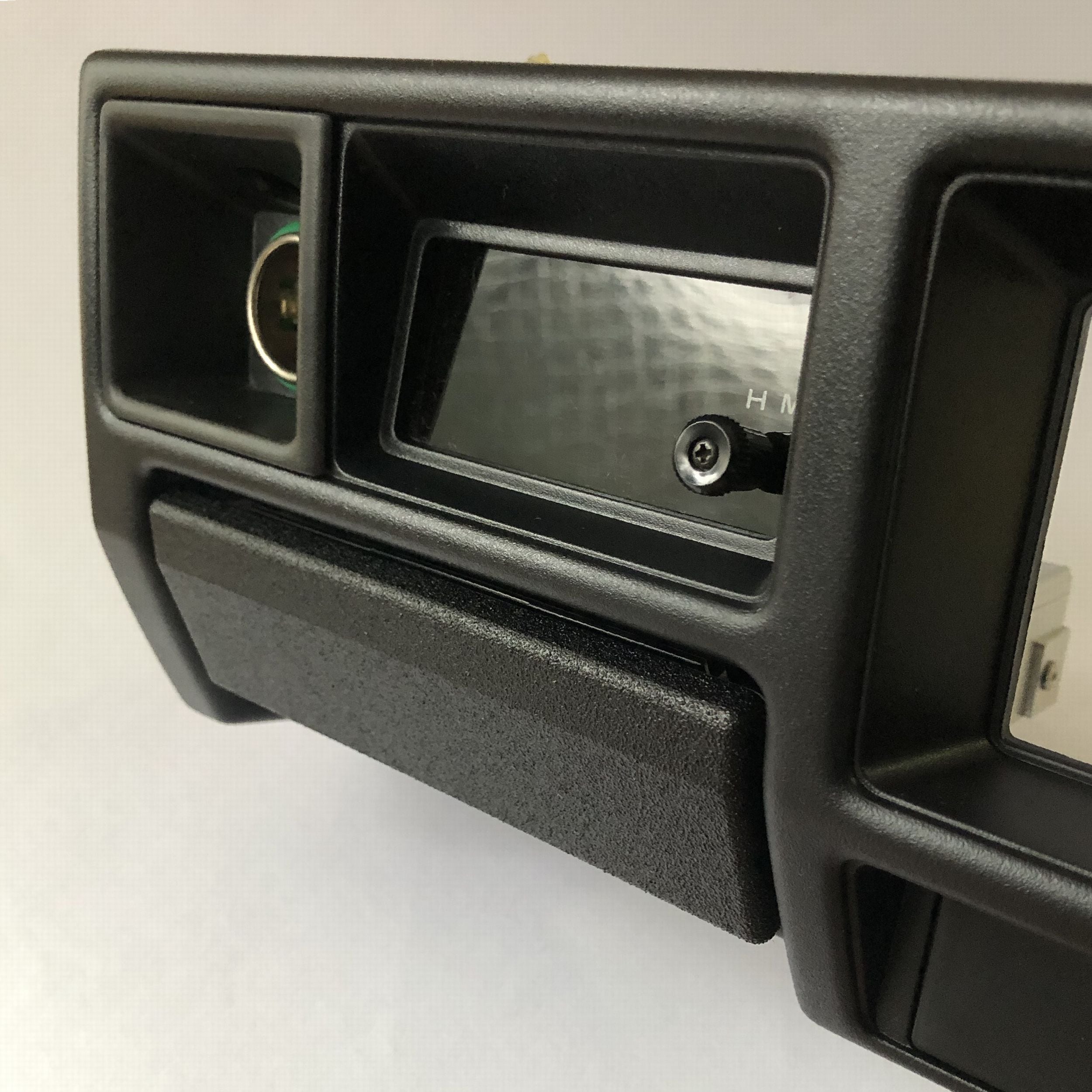 できるだけ純正の灰皿のようにみえるように前板を製作しています。灰皿周りのインパネはサンド調の仕上げです。違和感のないようにABS樹脂板に同様のサンド調塗装仕上げとしました。(艶消し黒色のみの設定)