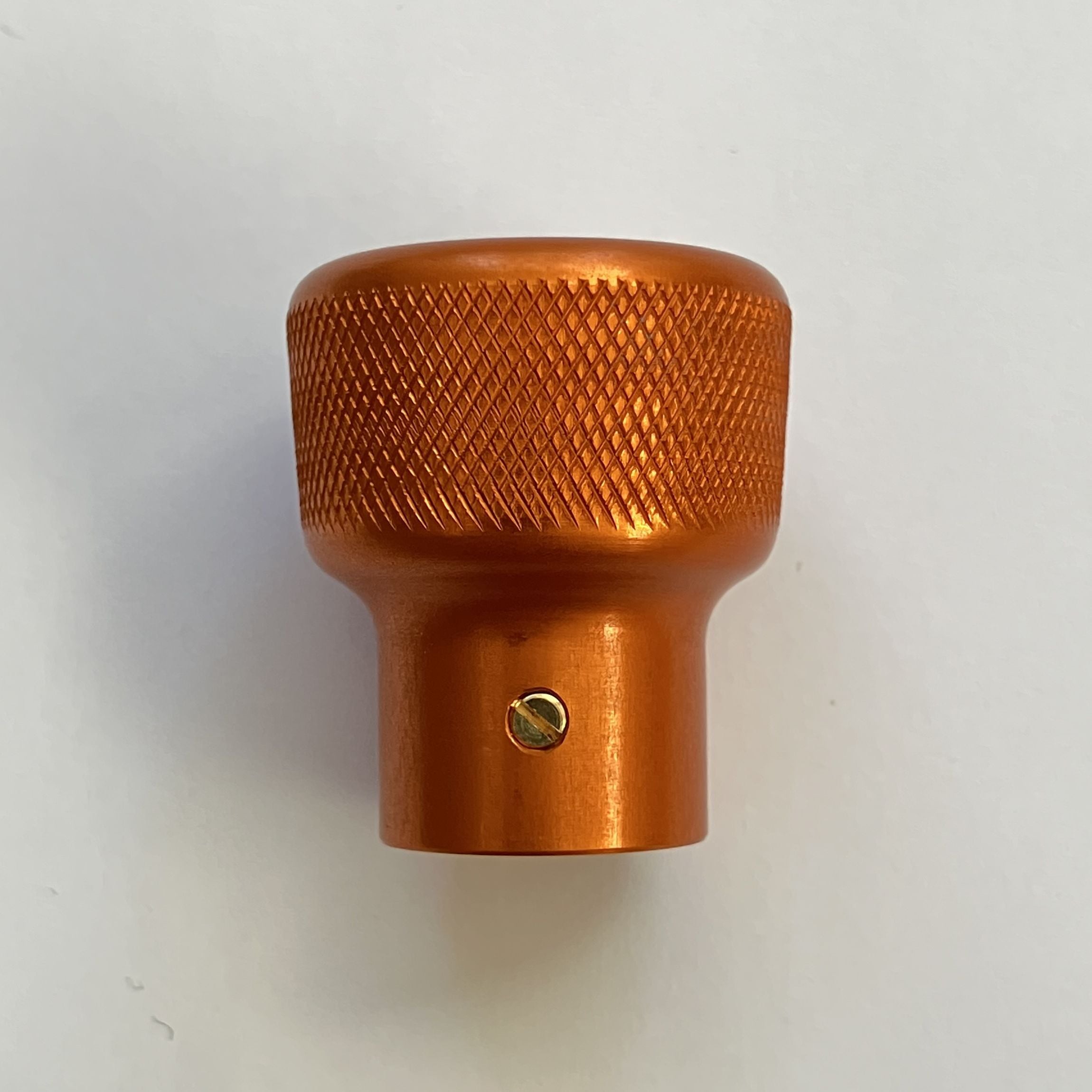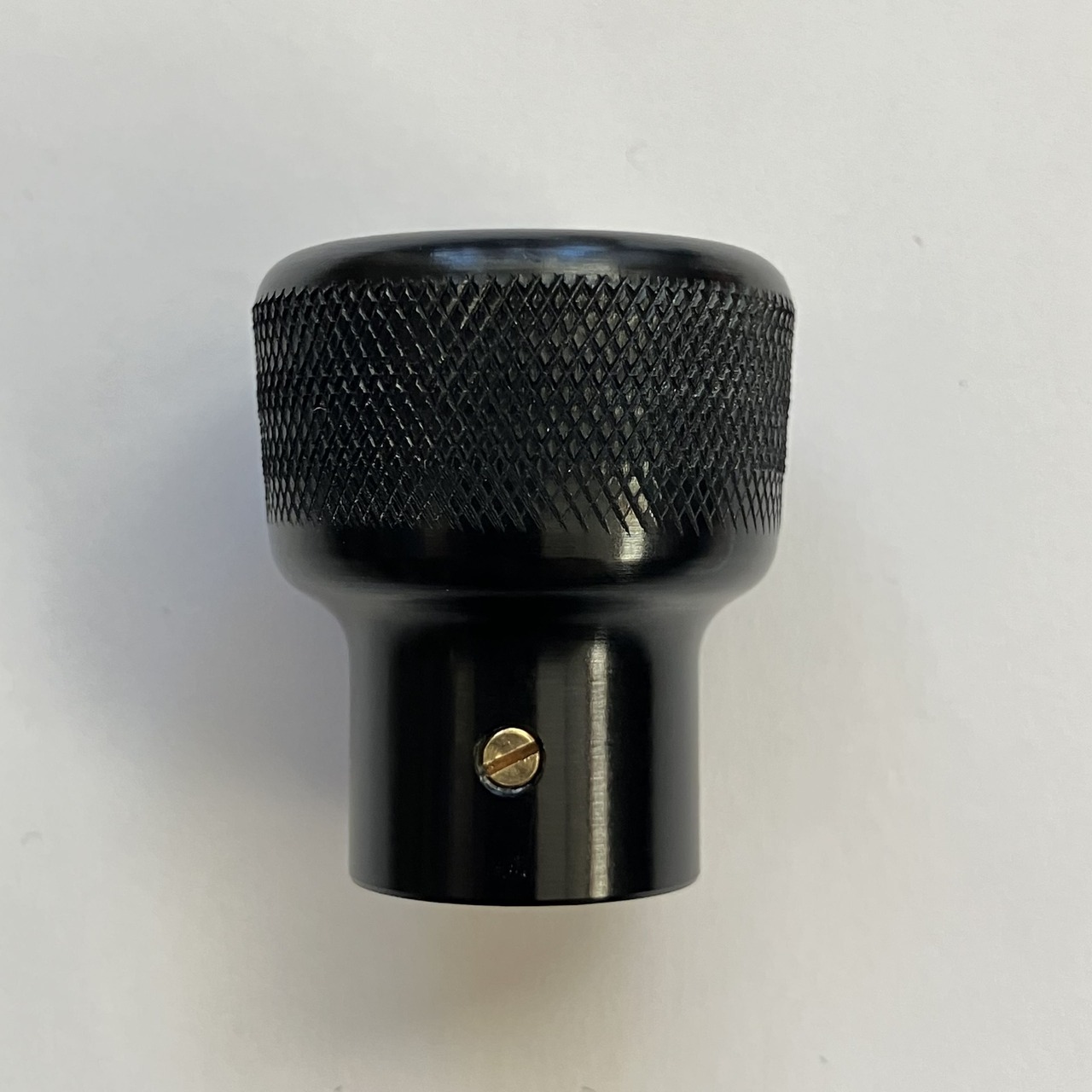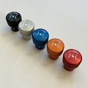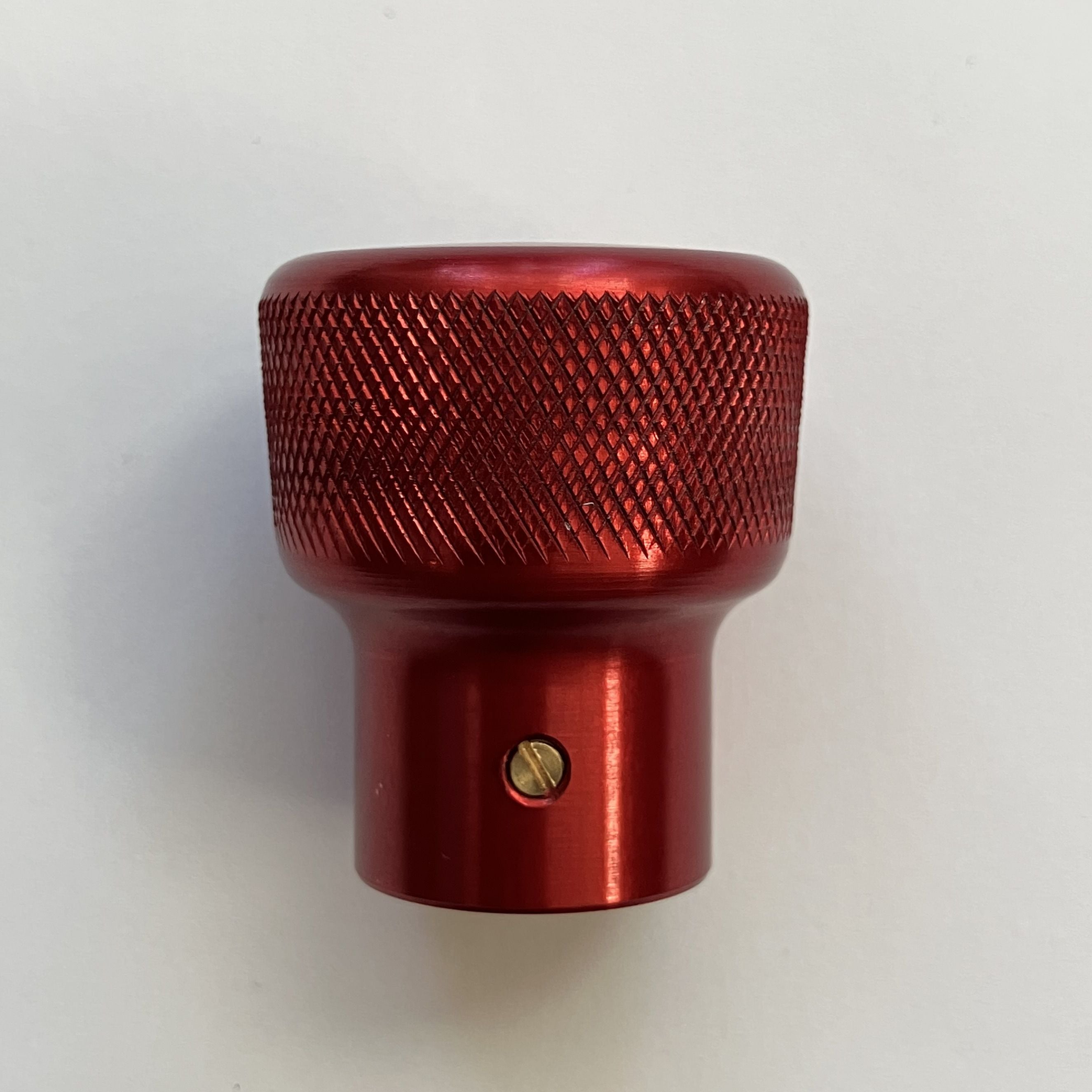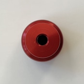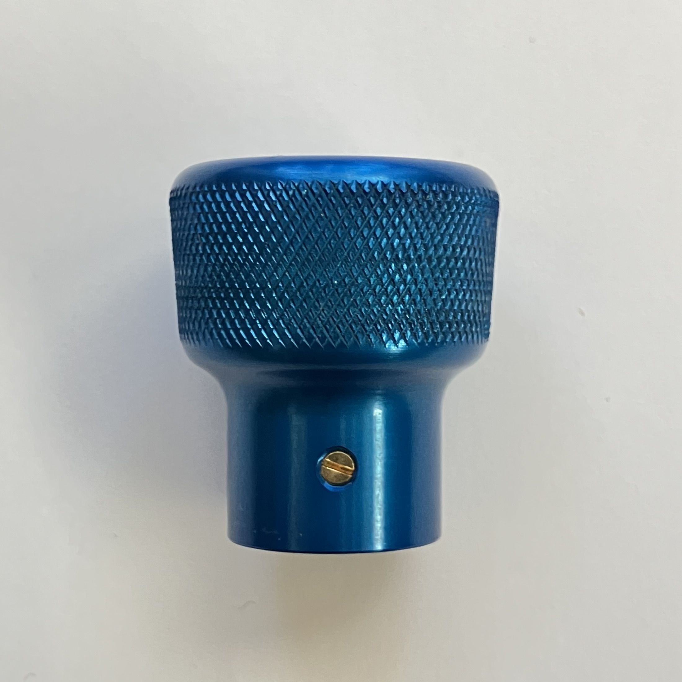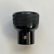 純正のスロットルコントロールノブはプラスチック製ですが、このスロットルコントロールノブはアルミ削り出しで製作しました。サイドにローレット加工を施し滑りにくくなっています。美しいカラーアルマイト仕上げはカスタム部品らしくワンポイントになります。ステアリングハンドルから見えるキラリと光るノブにニヤリとするでしょう。